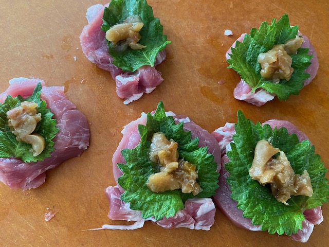 叩いた梅干しと しそをはさんで