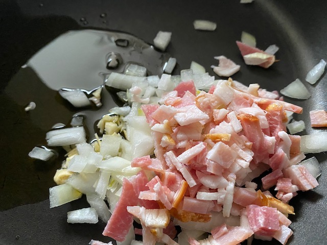 ベーコン・玉ねぎ にんにくはみじん切りにする