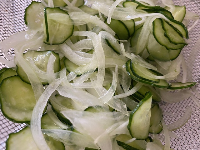 ②きゅうりと玉ねぎはスライサーで薄く切り