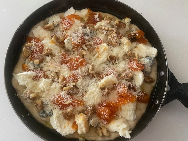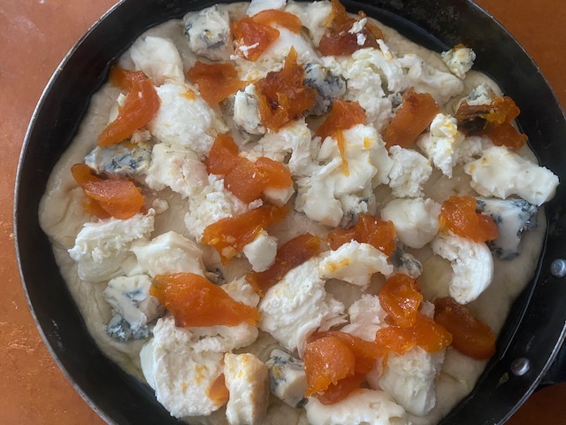 生地の上にちぎったチーズ(タレッジョ・モッツァレッラ・