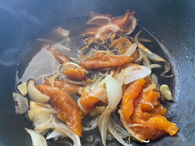 玉ねぎとにんにく あんぽ柿を加えて炒め