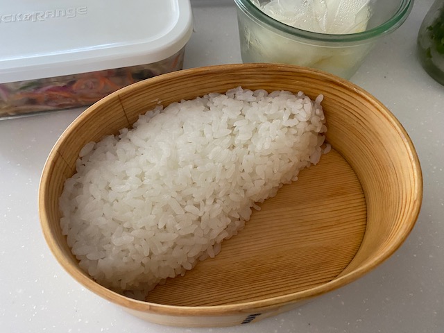 ②お弁当箱にご飯を 斜めに詰め