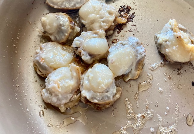 大きめのフライパンで ホタテとスナップエンドウを