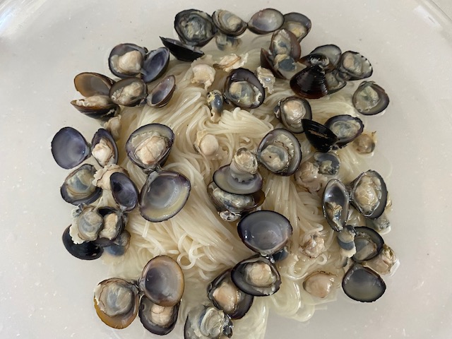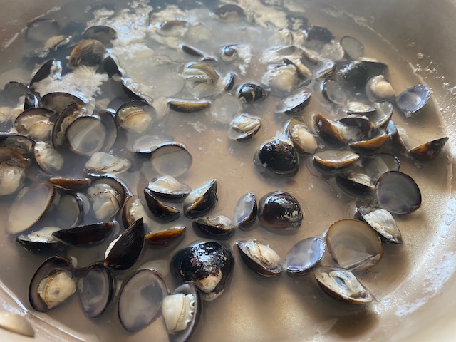 ①しじみと水を加え蓋をしてしじみを加熱して殻をひらき