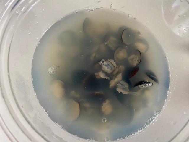 しじみは塩を少々加えた水につけて冷蔵庫に一晩