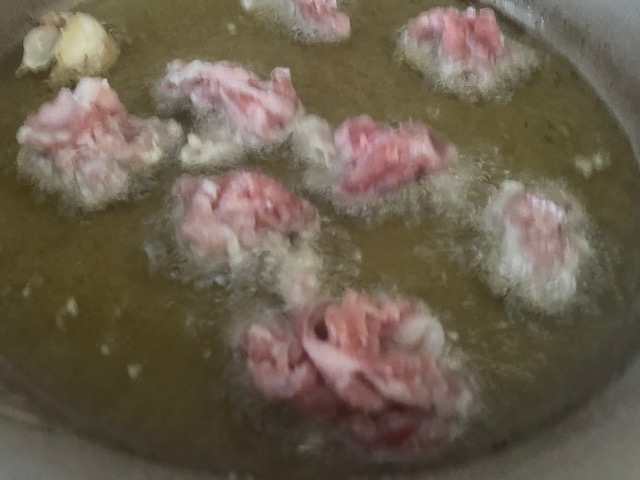 ①豚肉は一枚一枚広げてチューブにんにく・しょうが