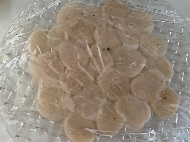 ①ホタテの水分をしっかり拭き取り