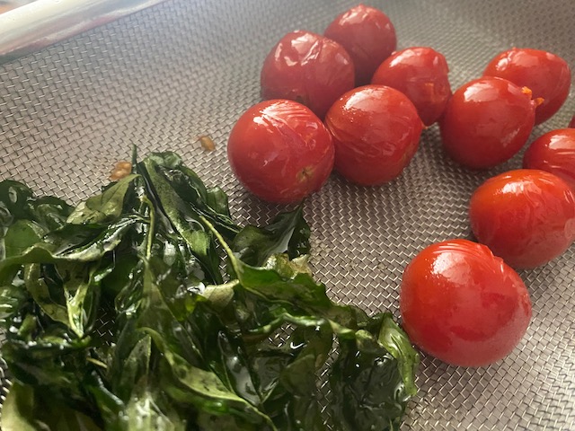 プチトマトと バジリコは揚げオイルで素揚げする