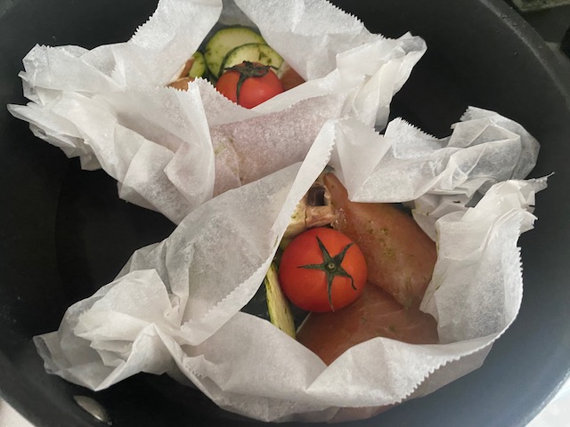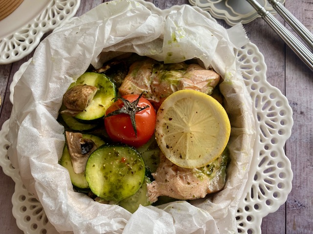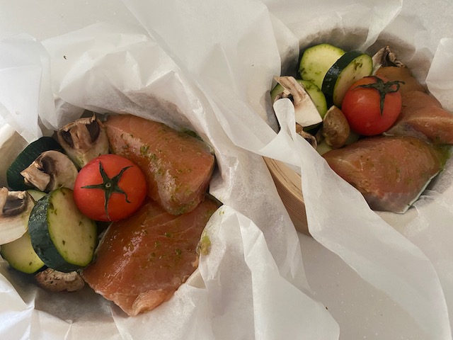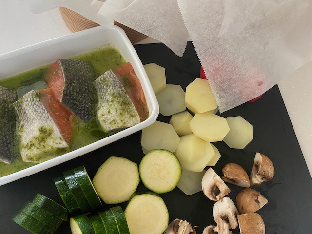 秋鮭は半分に切り 白ワインとバジルソースに