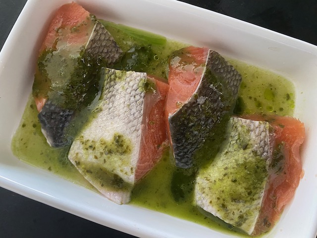 秋鮭はバジルソースと白ワインでマリネしてから蒸します