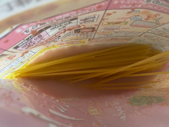 ①袋の切り口を切り 水と半分に折ったスパゲッティーニをいれ