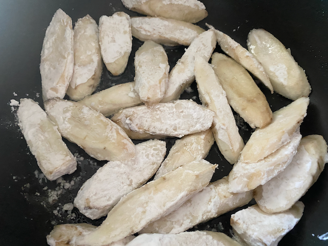 ①全体に片栗粉をまぶしたごぼうを