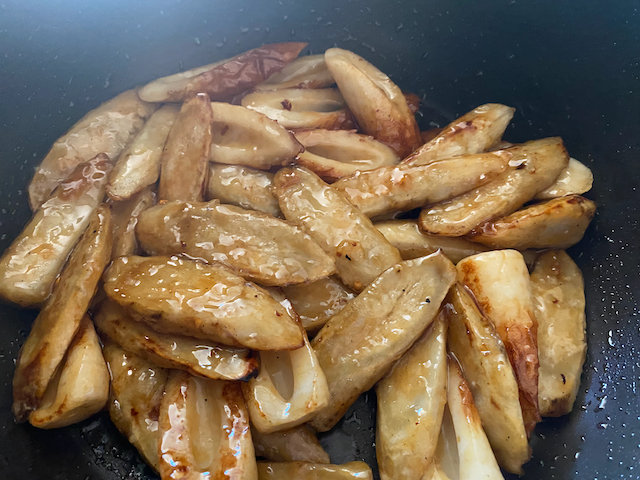 ごぼうは 片栗粉をまぶしてから焼くので
