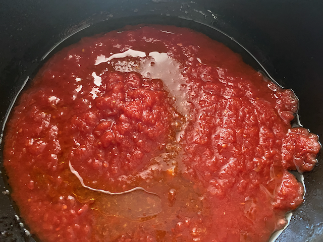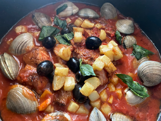 焼いてからトマト缶を加え煮て あさり ブラックオリーブ