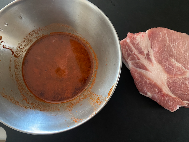 豚ロース肉にしっかりまぶし 冷蔵庫で1時間マリネする