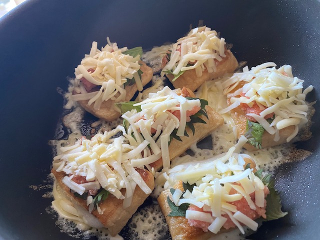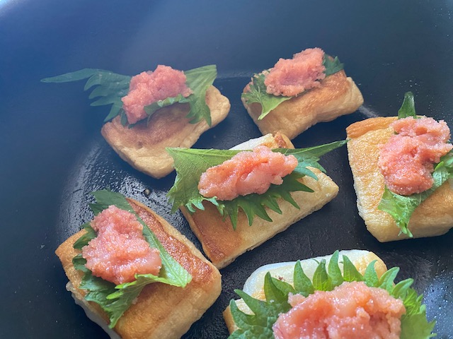明太子としそチーズを乗せてカリッと焼いた