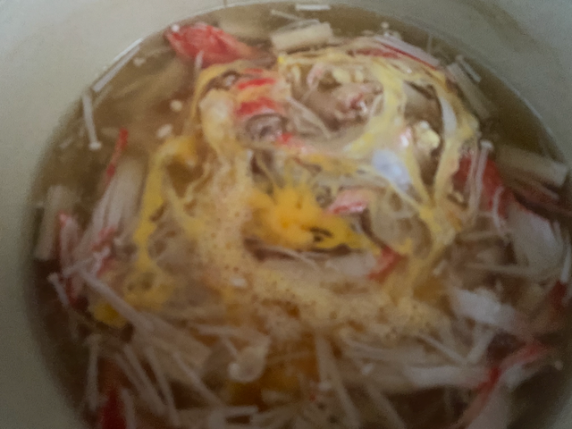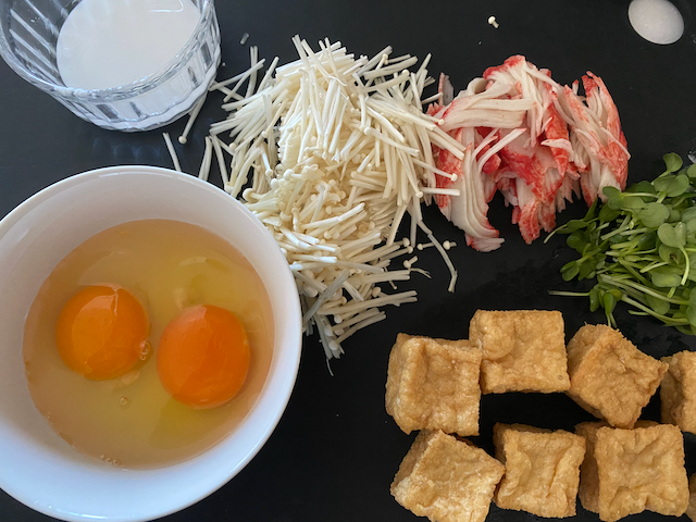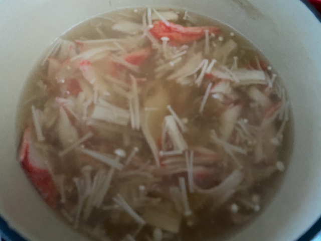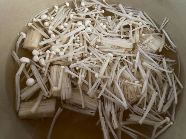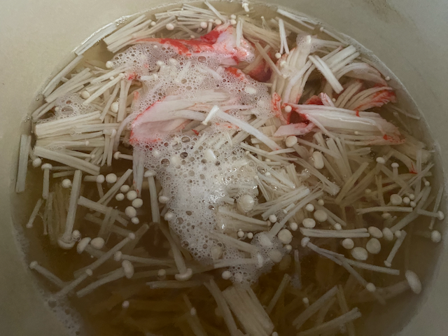 ①だし汁を火にかけえのきを加え一煮立ちさせ