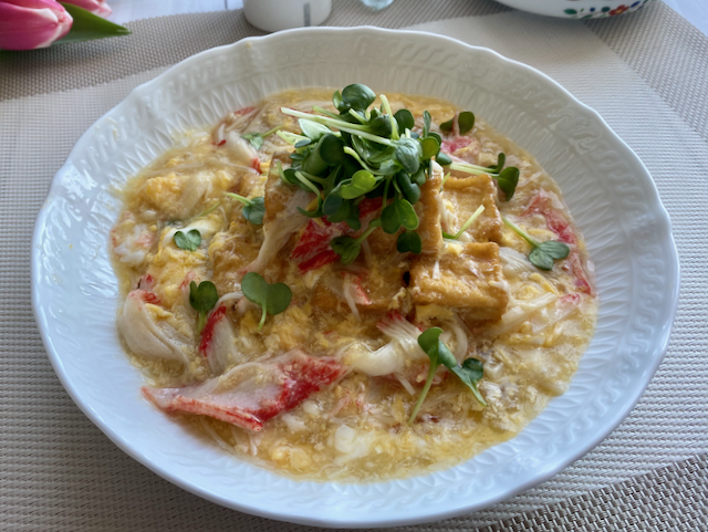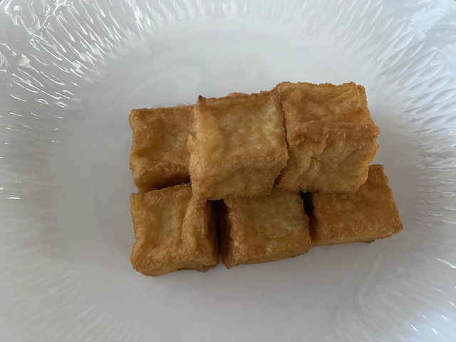 4等分に切り カニカマはほぐし 厚揚げは6等分に切り