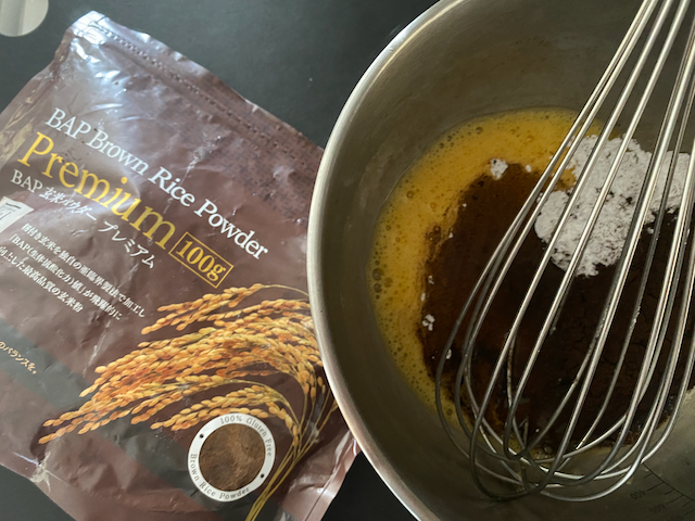 ②溶きほぐした卵に粉砂糖と 玄米パウダープレミアムを