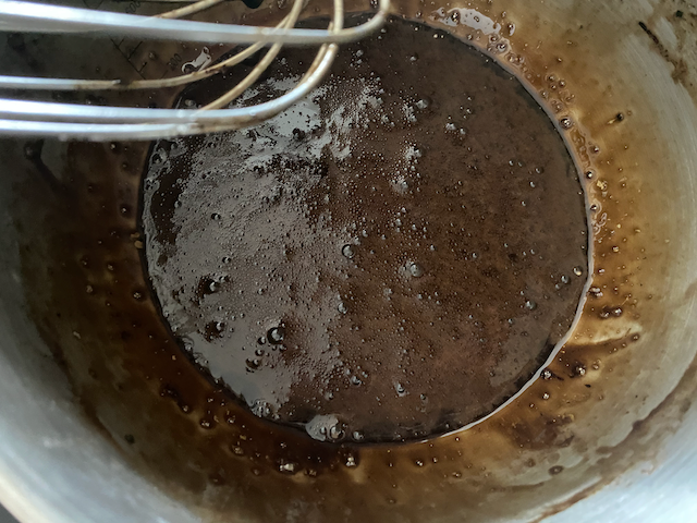 ①ダークチョコレートと刻んだバターを湯煎にかけて溶かす