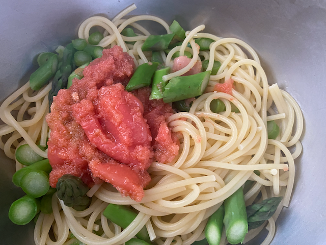 ②スパゲッティの茹で上がり1分前に残りのアスパラを加え