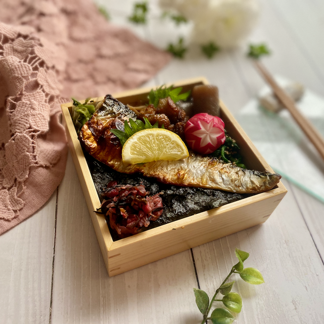 ご飯には海苔を敷き詰め 鯖の塩焼きをど〜んと