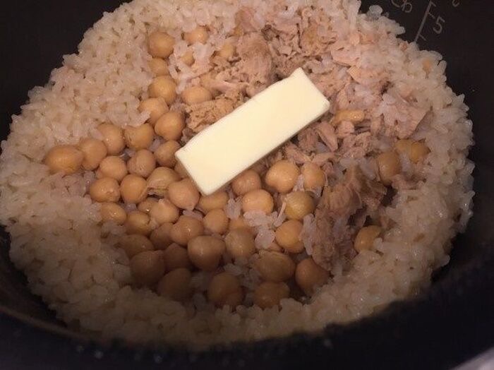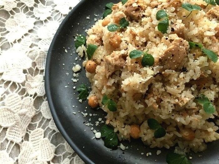 ツナ缶とひよこ豆を加えた洋風な炊き込みごはん