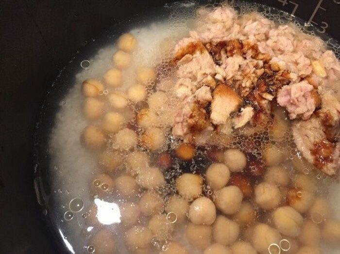 目盛りに合わせて水を入れ 水気を切ったひよこ豆