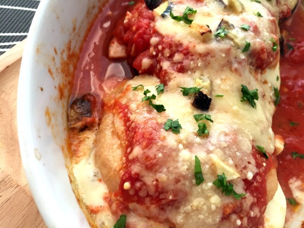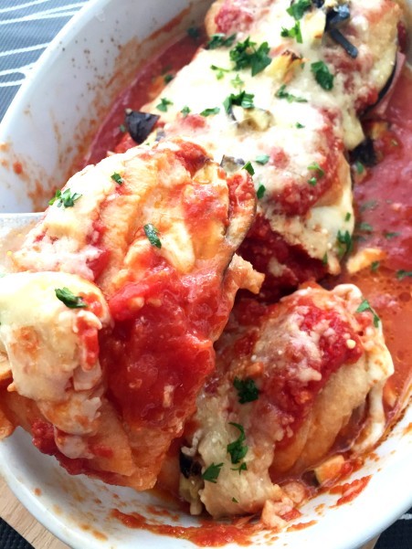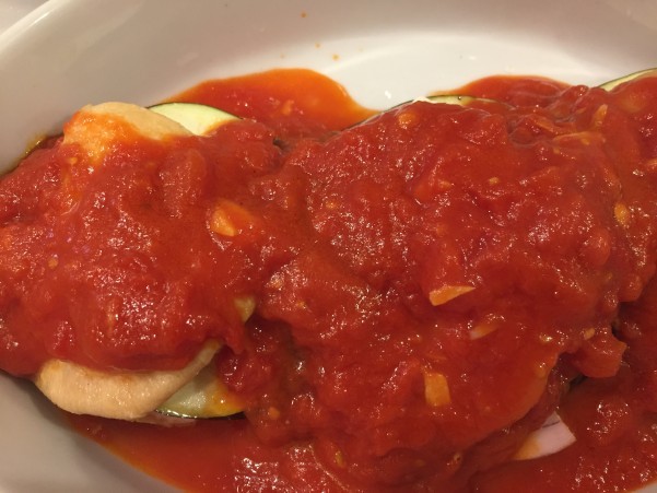 耐熱皿に並べ ニンニクをきかせたトマトソースをたっぷりとのせます