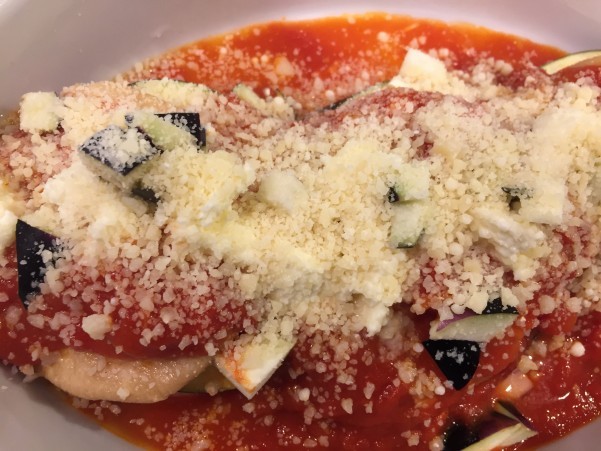 ⑤残った茄子を細かく切ったものと モッツァレッラ パルミジャーノをふる