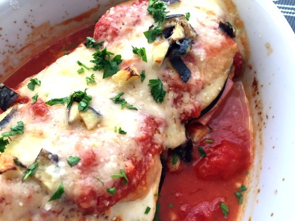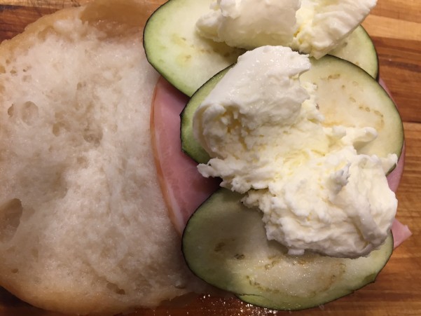 半分に切り込みを入れて ハムと茄子とモッツァレッラをサンド